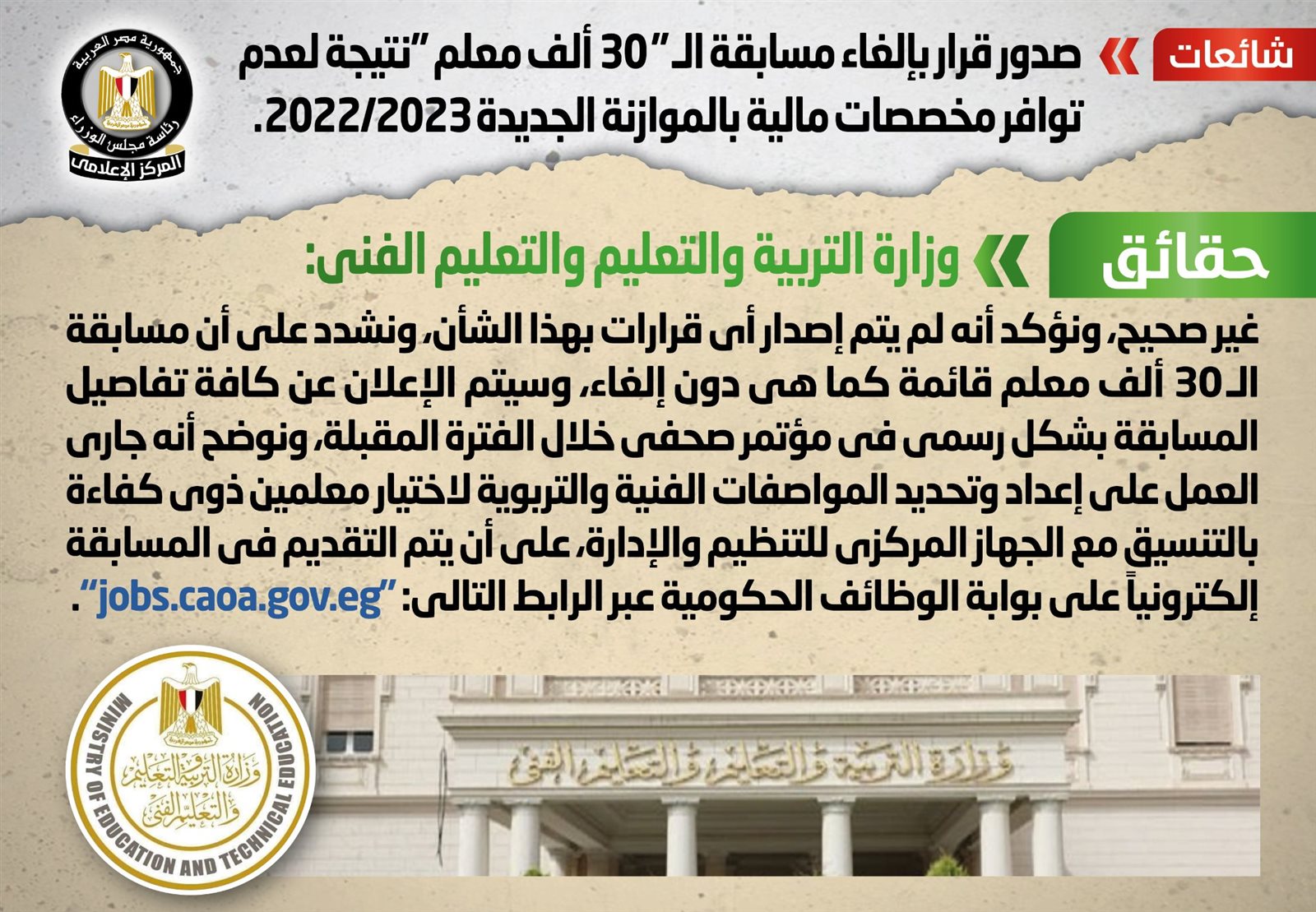 وتواصل المركز الإعلامي، لمجلس الوزراء مع وزارة التربية والتعليم والتعليم الفني، والتي نفت تلك الأنباء، مُؤكدةً أنه لا صحة لإلغاء مسابقة الـ 30 ألف معلم، نتيجة لعدم توافر مخصصات مالية بالموازنة الجديدة 2022/2023، وأنه لم يتم إصدار أي قرارات بهذا الشأن.
