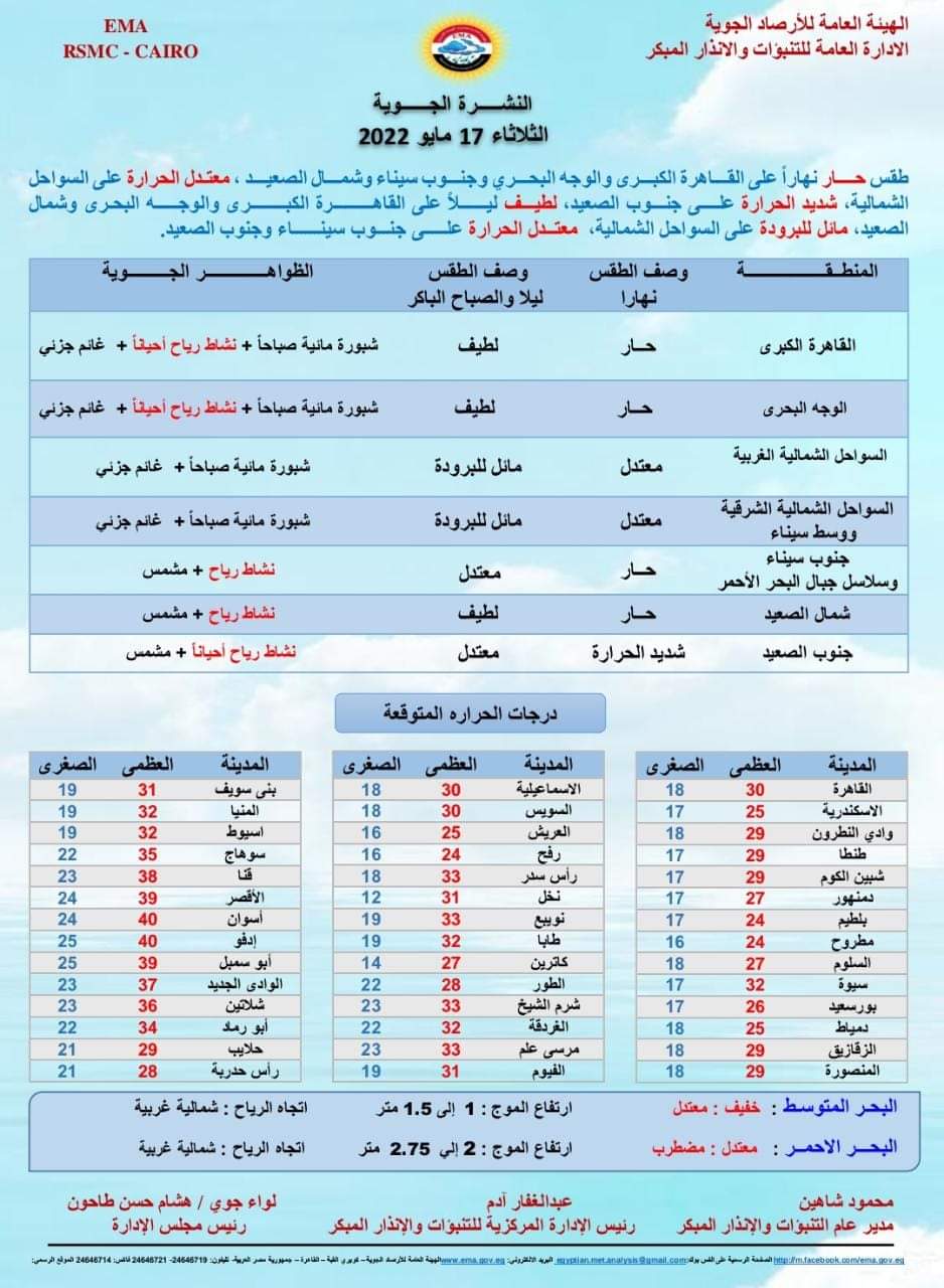 تتوقع الهيئة العامة للأرصاد الجوية، أن يسود غدًا الثلاثاء، طقس حار نهارًا على القاهرة الكبرى والوجه البحري، وجنوب سيناء وشمال الصعيد، بينما يكون معتدل الحرارة على السواحل الشمالية، ويصبح شديد الحرارة على جنوب الصعيد.