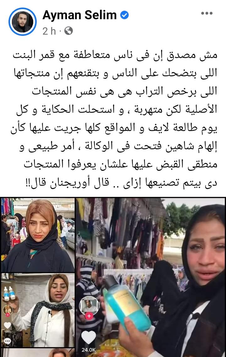 وقال مستخدم: مش مصدق إن فيه ناس متعاطفة مع قمر البنت اللي بتضحك على الناس وبتقنعهم إن منتجاتها اللي برخص التراب هي هي نفس المنتجات الأصلية لكن متهربة، واستحلت الحكاية وكل يوم طالعة لايف كأن إلهام شاهين فتحت في الوكالة، أمر طبيعي ومنطقي القبض عليها علشان يعرفوا المنتجات دي بيتم تصنيعها إزاي، قال أوريجنال قال.