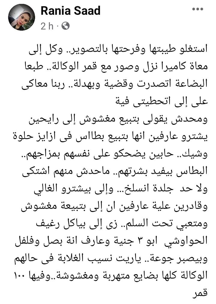 وكتبت أخرى: ربنا معاكى على إللى اتحطيتى فيه، ومحدش يقولى بتبيع مغشوش، اللى رايحين يشتروا عارفين أنها بتبيع بطاطس فى أزايز حلوة وشيك، حابين يضحكوا على نفسهم بمزاجهم، البطاس بيفيد بشرتهم، محدش منهم اشتكى ولا حد جلدة انسلخ، واللى بيشتروا الغالي وقادرين علية عارفين إن اللى بتبيعه مغشوش ومتعبي تحت السلم، زى اللى بياكل رغيف الحواوشي أبو 3 جنيه وعارف أنه بصل وفلفل وبيصبر جوعه، ياريت نسيب الغلابة فى حالهم،الوكالة كلها بضايع متهربة ومغشوشة وفيها 100 قمر.