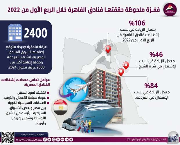واستعرض الانفوجراف أبرز ما أعلنته مؤسسة "كوليرز إنترناشيونال" عن توقعات إشغالات الفنادق المصرية خلال الربع الأول من 2022، وأشار إلى توقع إضافة 4200 غرفة فندقية جديدة لسوق الفنادق المصرية، لتشهد الغردقة وحدها إضافة أكثر من 2000 غرفة بحلول 2024.