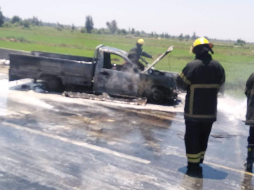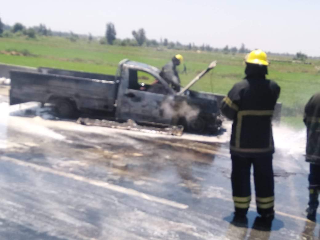 تفحم سيارة ربع نقل وإصابة 3 أشخاص في حادث علي طريق جمصة بالدقهلية