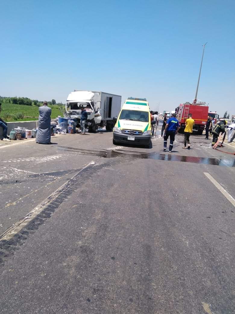 وانتقل ضباط المباحث وقوات الحماية المدنية وسيارات الإسعاف الي مكان الحادث، وبالفحص تبين وقوع الحادث بين سيارتين نقل وسيارة ملاكي، على طريق جمصة الدولي، واشتعال النيران بإحدى السيارات النقل.