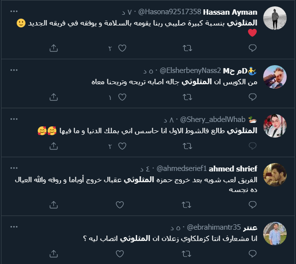 وأضاف أحد الحسابات: أكتر واحد فرحان بإصابة حمزة المثلوثي هو فيريرا، وقال آخر: ربنا يعدي جيشك على خير يا حبيبي ياللي كسرت المثلوثي.. دي عندي أعز من الضربة الجوية، فيما قال ثالث: اللهم لك الحمد إصابة لاعبنا حمزة المثلوثي.