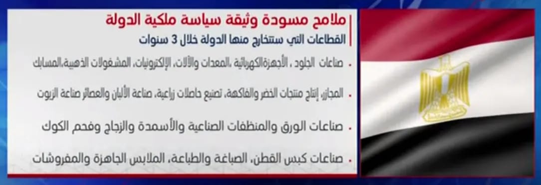 وقالت الحديدي إن المسودة الخاصة بالوثيقة قسمت القطاعات لثلاثة قطاعات رئيسية، أولها قطاعات تتخارج منها الدولة كلية خلال ثلاث سنوات مثل زراعة الحبوب، ما عدا القمح والاستزراع السمكي والثروة الحيواني والموانئ الجافة والبرية والنقل البحري ومحطات تحلية المياه من قطاع مياه الشرب والقطاع الخاص أكثر كفاءة في ذلك، وعدد من أنشطة البرمجيات والحاسب ونشر وإنتاج التلفزيون وتجارة التجزئة خدمات الإقامة والغذاء والمشروبات، والتشييد والبناء فيما عدا الإسكان الاجتماعي وغيرها.