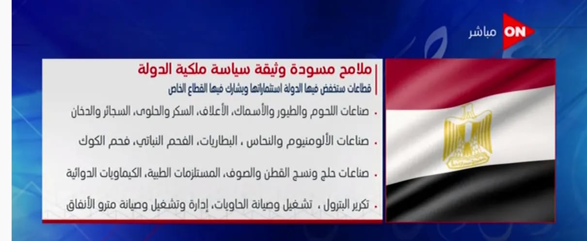 كشفت الإعلامية لميس الحديدي مسودة وثيقة ملكية الدولة، التي أعلن عنها رئيس الوزراء الدكتور مصطفى مدبولي، وأرسلت لقطاعات من رجال الأعمال والاتحادات المتخصصة للمناقشة قبل طرحها رسميًا نهاية مايو الجاري، قائلة: مسودة الوثيقة مكونة من 48 صفحة وبها عدد من الأهداف أهمها رفع معدلات النمو الاقتصادي وتمكين القطاع الخاص، وتركيز تدخل الدولة في ضخ الاستثمارات والملكية في أصول تعد عملًا أصيلًا للدولة مثل البنية التحتية والتعليم والصحة وحكومة تواجد الدولة في الأنشطة الاقتصادية.