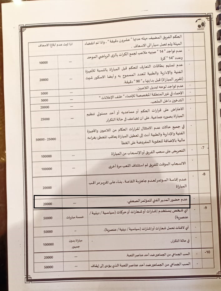 تنص لائحة رابطة الأندية للموسم الحالي من بطولة الدوري الممتاز، أنه يُعاقب أي مدير فني يمتنع عن حضور المؤتمر الصحفي الخاص بالمباراة، بالغرامة 20 ألف جنيه فقط.