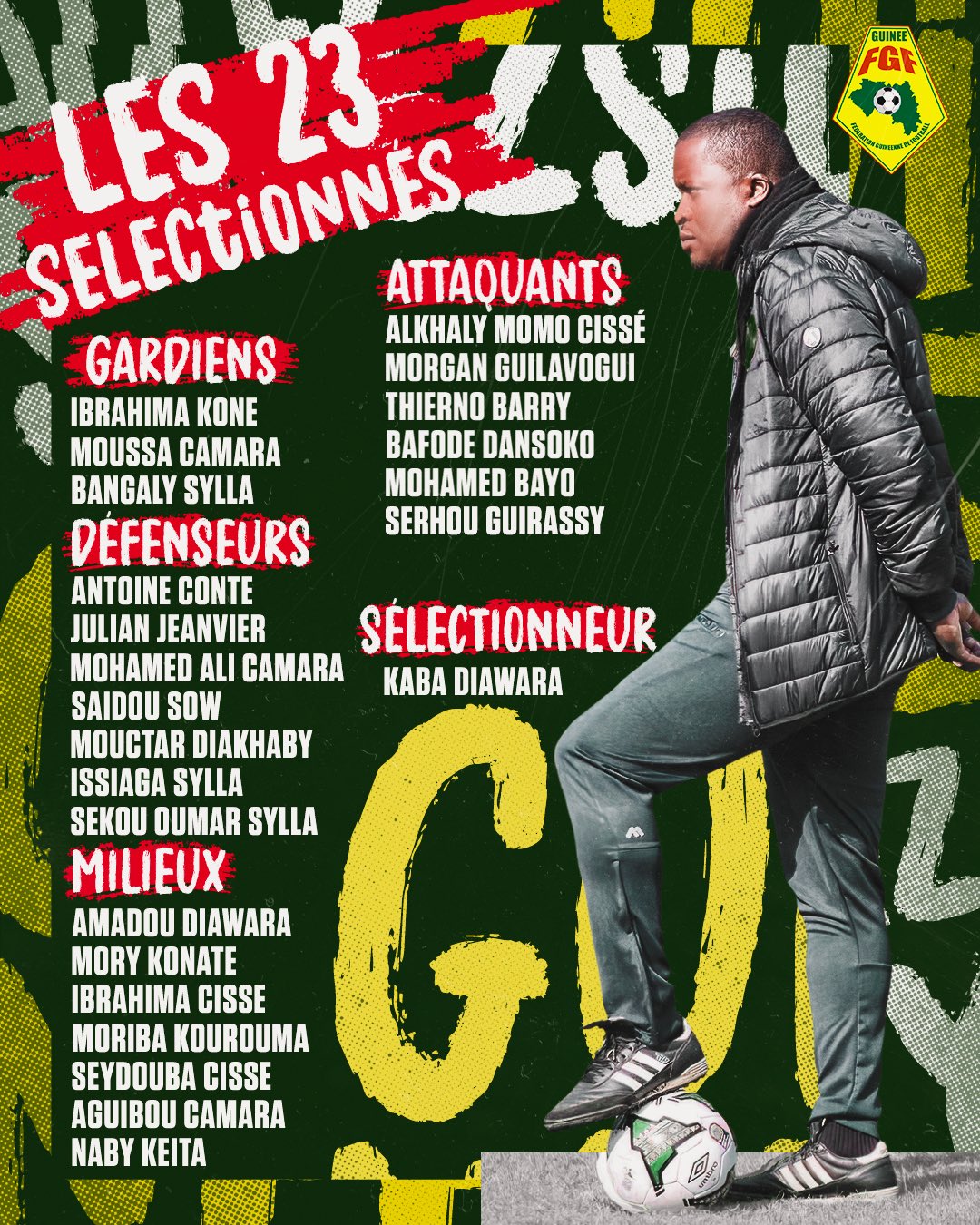 أعلن كابا دياورا، المدير الفني لمنتخب غينيا، قائمة فريقه التي ستدخل لمواجهة منتخب مصر، في المباراة التي ستجمع بين الفريقين ضمن منافسات تصفيات كأس الأمم الإفريقية في كوت ديفوار 2023.