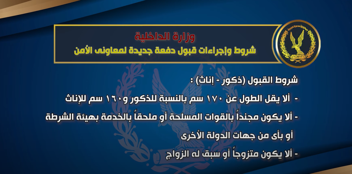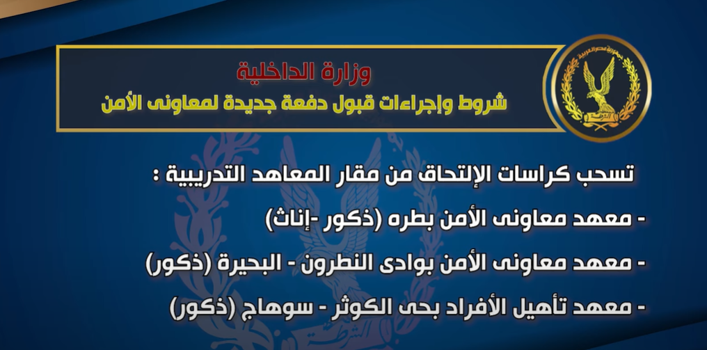وكانت أصدرت وزارة الداخلية بيان لها في ذات الشأن أكدت خلاله على بدء قبول دفعة جديدة للراغبين في التقدم لاجتياز اختبارات قبول دفعة جديدة بمعاهد معاوني الأمن، من الذين يجتازون الاختبارات المقررة، وتنطبق عليهم الشروط العامة.