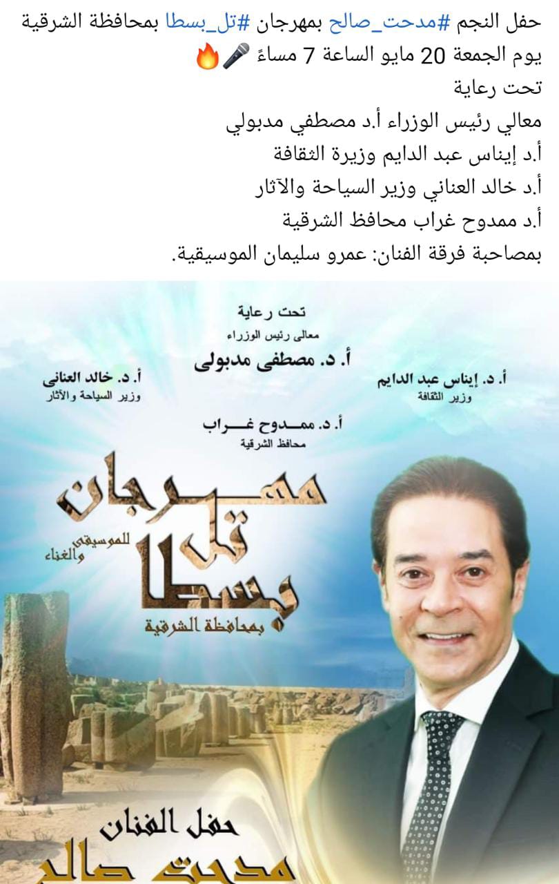 يحيي المطرب مدحت صالح حفل افتتاح مهرجان تل بسطا، وذلك بمحافظة الشرقية يوم 20 مايو، والمقرر بدأ الحفل الساعة 7 مساءً.
