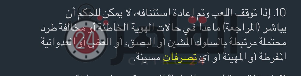 إذا توقف اللعب وتم إعادة استئنافه، لا يمكن للحكم أن يباشر المراجعة ماعدا في حالات الهوية الخاطئة أو مخالفة طرد محتملة مرتبطة بالسلوك المشين أو البصق، أو العض أو العدوانية المفرطة أو المهينة أو أي تصرفات مسيئة.