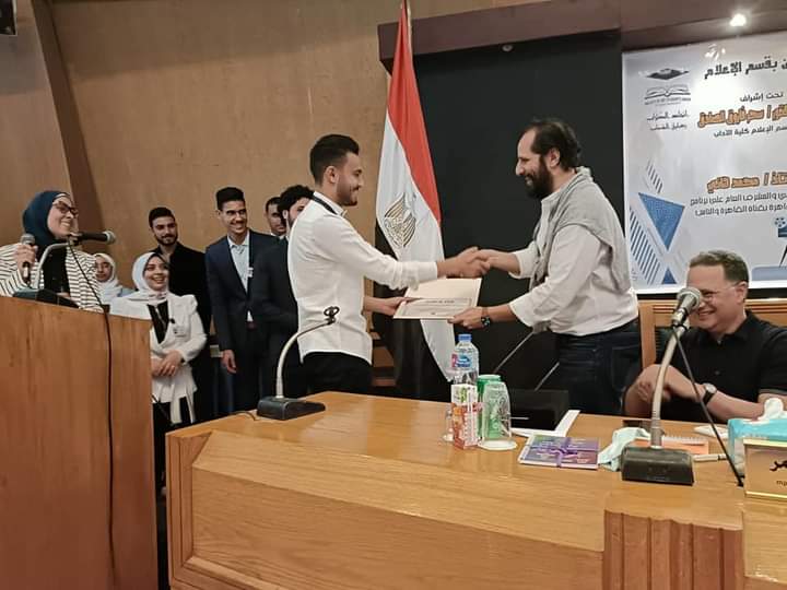 وفي ختام فعاليات اليوم قامت الدكتورة سحر فاروق الصادق رئيس قسم الإعلام بكلية الآداب بتسليم كلا من الفنان أحمد أمين، الإعلامي شريف عامر مقدم برنامج يحدث في مصر، ومحمد هاني الخبير الإعلامي والمشرف العام على برنامج حديث القاهرة بقناة القاهرة والناس، درع الكلية تقديرا لهم.