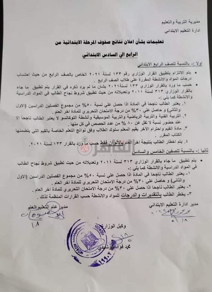 وأكدت وزارة التربية والتعليم والتعليم الفني، أنه يتم إخطار الطالب بنتيجة آخر العام بالألوان فقط حسب ما ورد بالقرار 133 لسنة 2021.