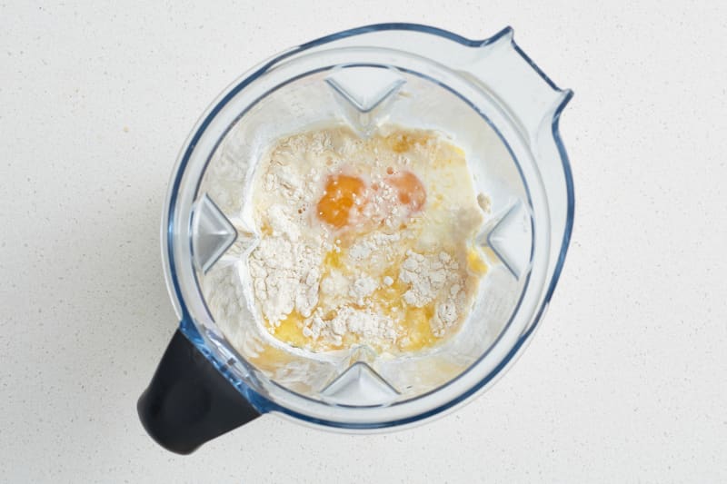 وبعدها يوضع مقدار الدقيق إلى المقدار السائل في الخلاط حتى يسهل الخفق مرة أخرى، وهو ما يتطلب الخفق على السرعة المتوسطة ولمدة 3 دقائق لضمان الحصول على عجينة الكريب الناعمة والمتجانسة بدون تكتلات الدقيق.