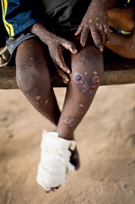 وينتشر الطفح الجلدي في اليدين والرجلين والظهر والصدر، ويتحول الطفح الجلدي إلى جروح بقعية على شكل تقرحات وبثور تفوح منها رائحة كريهة.