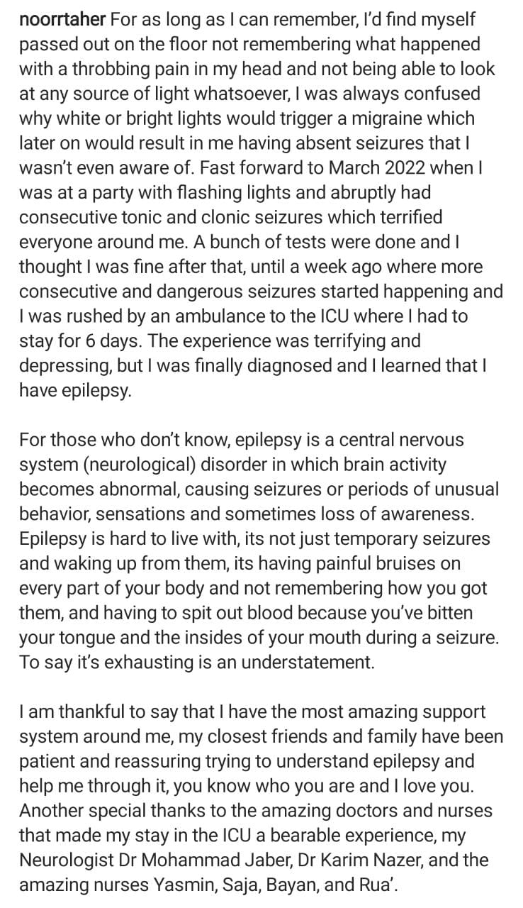 وقالت نور طاهر: أنا ممتنه لأقول إن لدي أروع نظام دعم من حولي، لقد تحلى أقرب أصدقائي وعائلتي بالصبر والطمأنينة في محاولة لفهم الصرع ومساعدتي خلال ذلك، أشكر بشكل خاص الأطباء والممرضات الرائعين الذين جعلوا إقامتي في وحدة العناية المركزة تجربة محتملة، وأيضا طبيب الأعصاب الدكتور محمد جابر، والدكتور كريم ناظر، والممرضات الرائعات ياسمين، سجى، بيان، ورؤى.