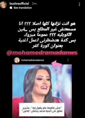 وكان الفنان محمد رمضان رد على انتقادات الفنانة بشرى، على أغنيته الجديدة بلالين التي طرحها أمس الأربعاء، عبر تطبيق أنغامي، ونشر تعليق بشرى عبر حسابه بموقع التواصل الاجتماعي فيس بوك، ووضع في الخلفية أغنية بلالين، معلقًا: فهمتي مع علامة استفهمام.