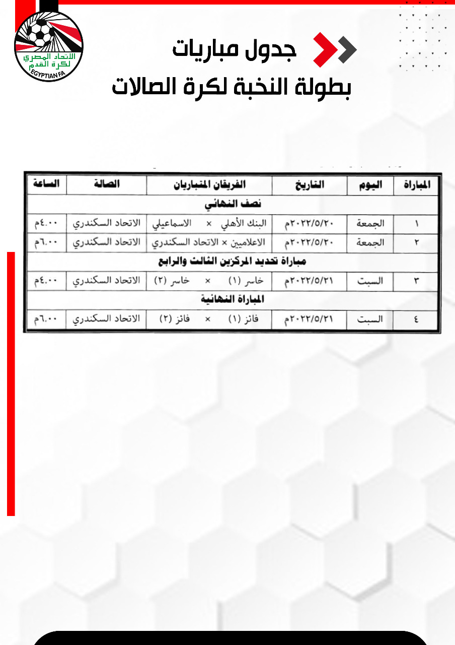 وتبدأ بطولة النخبة بمباراتي البنك الأهلي والإسماعيلي في الرابعة عصرًا ثم الإعلاميين والاتحاد السكندري في السادسة مساءًا على أن تقام مباراتي تحديد المراكز يوم السبت، وتقام مباريات بطولة النخبة لكرة الصالات على صالة نادي الاتحاد السكندري.