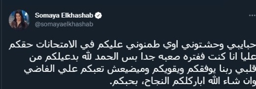 وكتبت سمية الخشاب عبر حسابها الرسمي على تويتر: حبايبي وحشتوني جدا طمنوني عليكم في الامتحانات، حقكم عليا أنا كنت بمر بفترة صعبة جدُا بس الحمد لله بدعيلكم من قلبي ربنا يوفقكم ويقويكم وميضيعش تعبكم علي الفاضي وإن شاء الله أبارك لكم على النجاح، بحبكم.