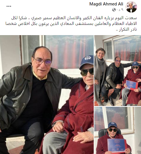كتب مجدي أحمد علي؛ تعليقًا على الصور، قائلًا: سعدت اليوم بزيارة الفنان الكبير الإنسان والعظيم سمير صبري.. شكرا لكل الأطباء العُظماء والعاملين بمستشفى المعادي؛ الذين يرعون بكل إخلاص شخصًا نادر.