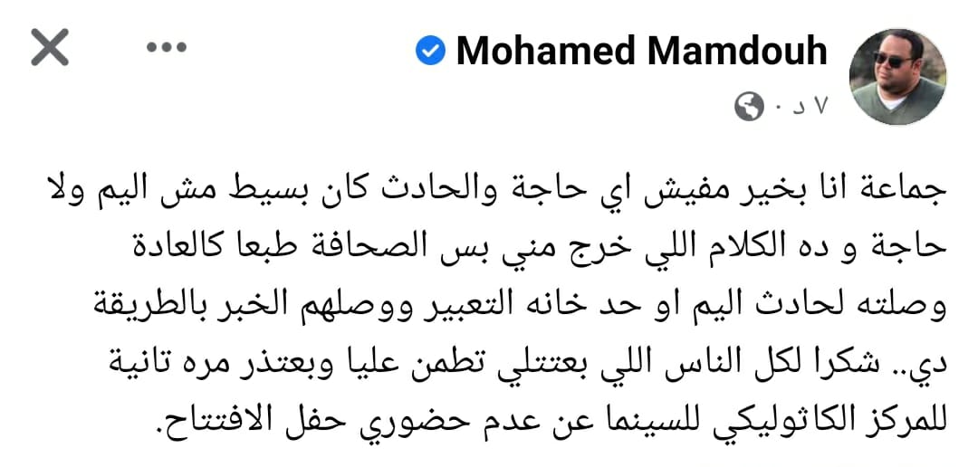 كما حرص محمد ممدوح، على توجيه رسالة شكر لكل متابعيه، حيث علق قائلًا: شكرا لكل الناس اللي بعتتلي تطمن عليا وبعتذر مرة تانية للمركز الكاثوليكي للسينما عن عدم حضوري حفل الافتتاح.
