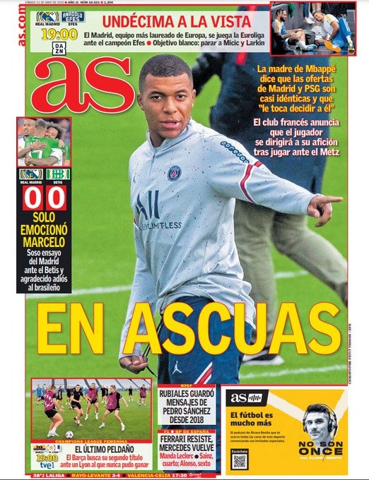 عنونت آس في غلافها اليوم بـ على الحافة، حيث قالت إن والدة مبابي تؤكد أن العروض من مدريد وباريس سان جيرمان متطابقة تقريبًا، وأن الأمر متروك له لاتخاذ القرار.