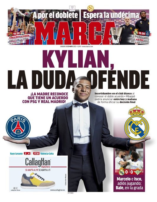 عنونت ماركا في غلافها بـ اختيارات كيليان، حيث قالت إن جدل مبابي مستمر مع حالة الشكوك في ريال مدريد بعد معرفتهم بالاتفاق المزدوج بناءً على تصريحات والدته، حول وجود اتفاق بينه وبين ريال مدريد وباريس سان جيرمان في آن واحد.