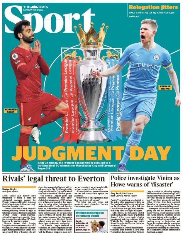 تصدر الدولي المصري محمد صلاح نجم فريق ليفربول، غلاف صحيفة تايمز وجهًا لوجه أمام نظيره كيفين دي بروين لاعب فريق مانشستر سيتي، حيث عنونت بـ يوم الحسم، في إشارة إلى أن غدًا الأحد سوف يشهد تحديد لقب البريميرليج.