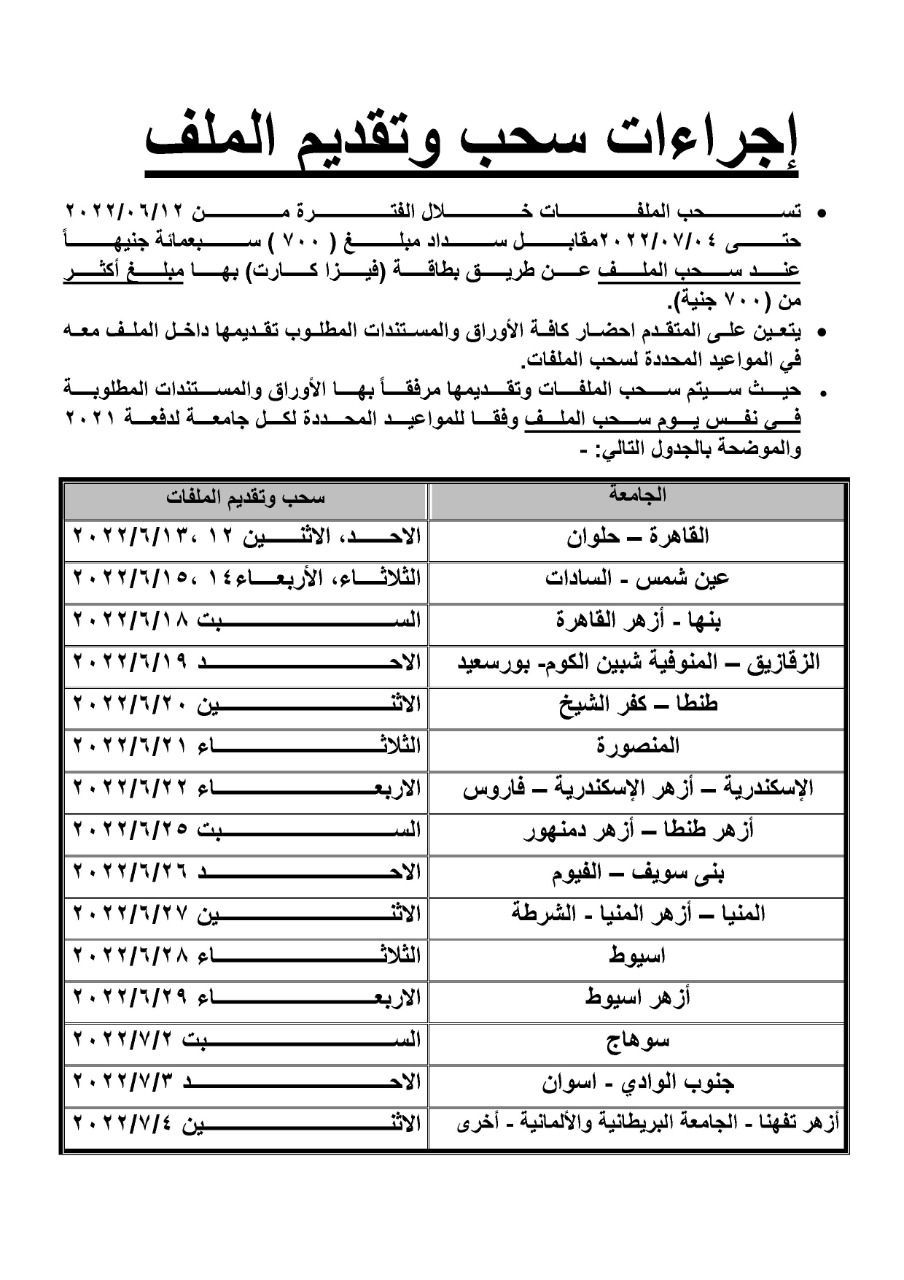 - تسحب الملفات خلال الفترة من 12 يونيو 2022 وحتى 4 يوليو 2022 مقابل 700 جنيه عند سحب الملف عن طريق (فيزا كارت) بها أكثر من 700 جنيه.