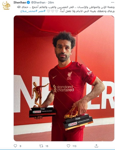 ونشرت شريهان، صورة لمحمد صلاح، عبر حسابها الشخصي بموقع التغريدات القصيرة تويتر، حيث قالت: ونعم الابن والمواطن والإنسان.. فخر المصريين والعرب والعالم أجمع.. حماك الله ورعاك وحفظك بعينه التي لا تنام ولا تغفل أبدًا.