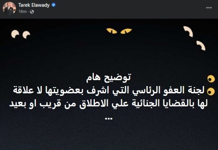 وكتب طارق العوضي عضو لجنة العفو الرئاسي عبر صفحته الشخصية علي موقع التواصل الاجتماعي فيسوك: لجنة العفو الرئاسي التي أشرف بعضويتها لا علاقة لها بالقضايا الجنائية على الإطلاق من قريب أو بعيد.