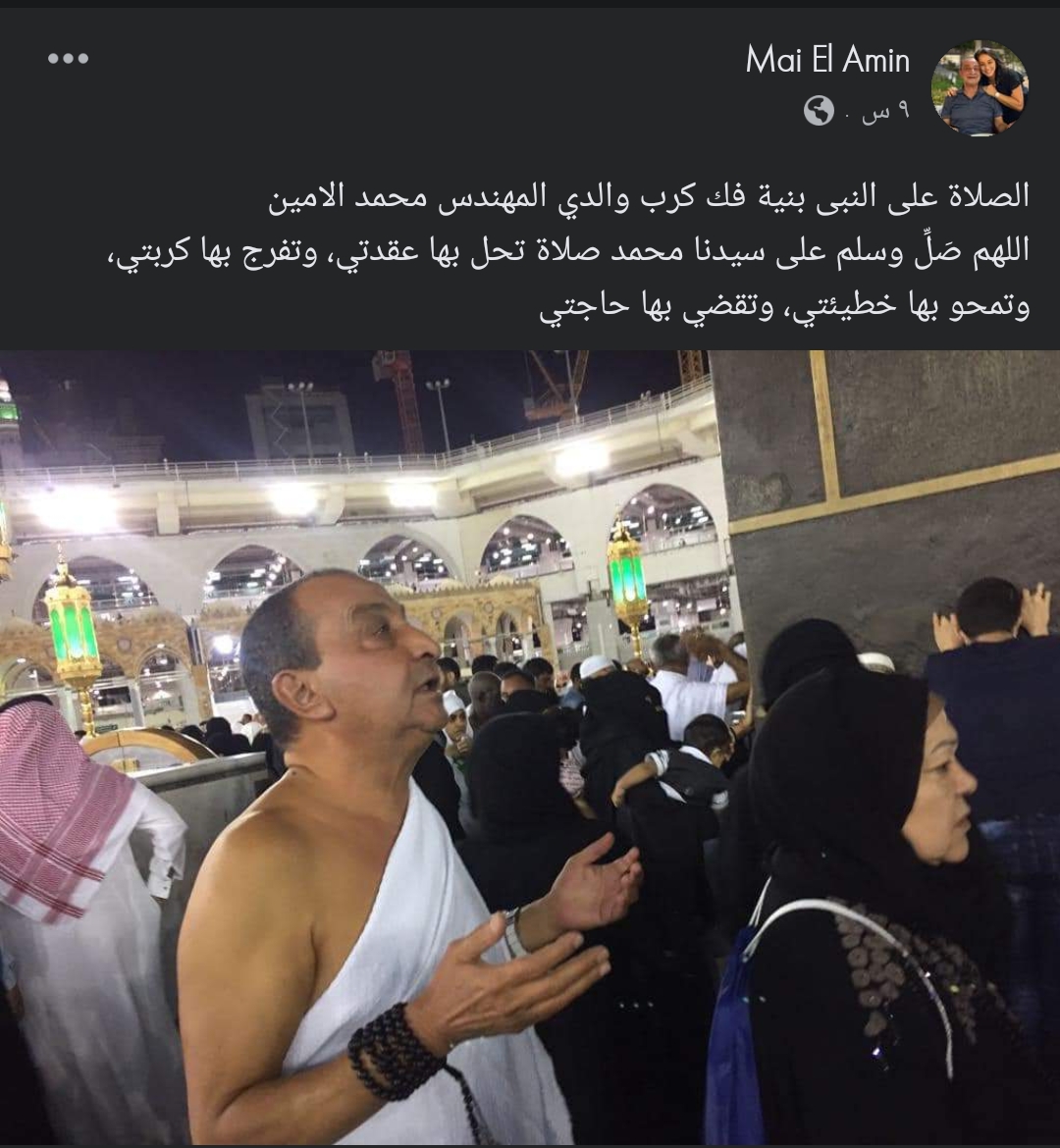 وطالبت مي محمد الأمين على صفحتها بموقع التواصل الاجتماعي فيس بوك، متابعيها بالصلاة على النبي -صلى الله عليه وسلم- بنية فك كرب والدها محمد الأمين، قائلة: اللهم صل وسلم على سيدنا محمد، صلاة تحل بها عقدتي وتفرج بها كربتي وتمحو بها خطيئتي وتقضي بها حاجتي.