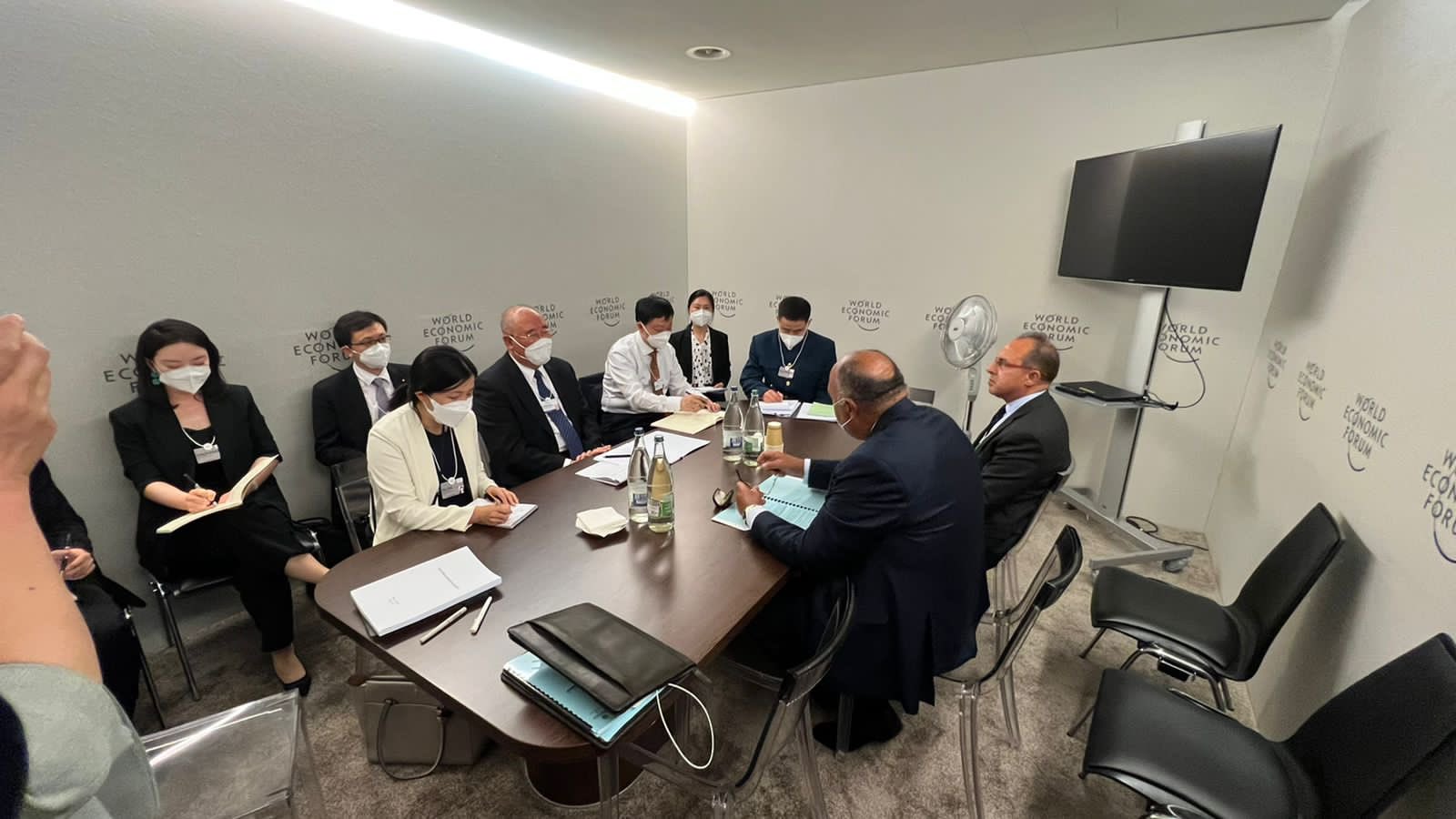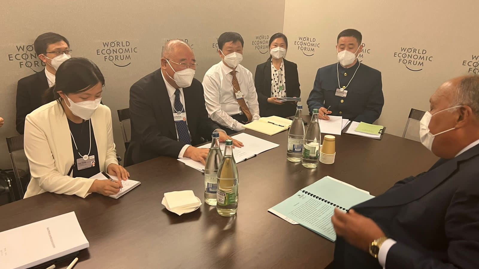 التقي سامح شكري وزير الخارجية، الرئيس المعين للدورة 27 لمؤتمر أطراف اتفاقية الأمم المتحدة الإطارية لتغير المناخ مبعوث المناخ الصيني شي شينهوا، على هامش فعاليات الاجتماع السنوي للمنتدى الاقتصادي العالمي.