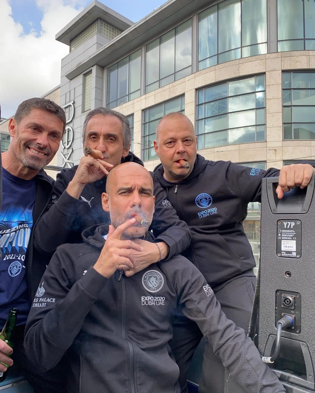 وظهر جوارديولا في الاحتفالية وهو يلتقط بين أصابعه سيجارة، حيث يقوم بـ الاحتفال بلقب الدوري الإنجليزي على طريق إبراهيموفيتش نجم إيه سي ميلان.
