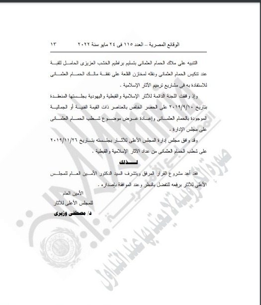 وأوضحت الجريدة الرسمية، أن المذكرة الإيضاحية لـ المجلس الأعلى للآثار، لقرار شطب الحمام العثماني بمنطقة القيسارية، تضمنت في المادة 14 أنه يجوز شـطب تـسجيل العقاري أو جزء منه، بقرار من الوزير بناء علـى اقتراح مجلـس الإدارة وبعد موافقة اللجنة المختصة، وينشر قرار الشطب في الوقائع المصرية ويبلـغ إلـى الأفراد والجهات التي أبلغت بتسجيله من قبل ويثبت ذلك على هامش تسجيل الأثر بالمجلس، وعلى هامش تسجيل العقار في مصلحة الشهر العقاري.