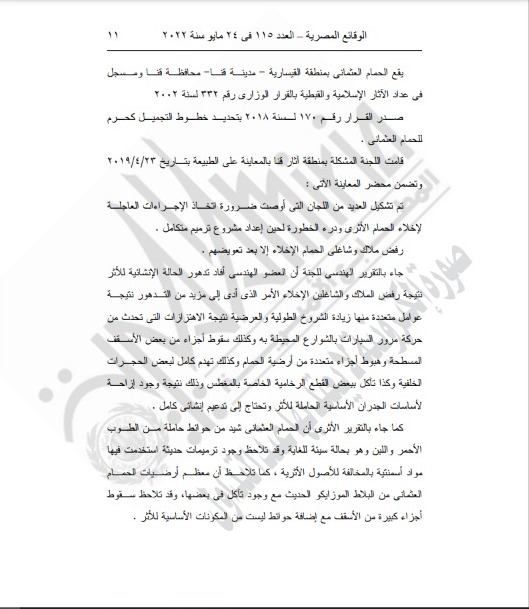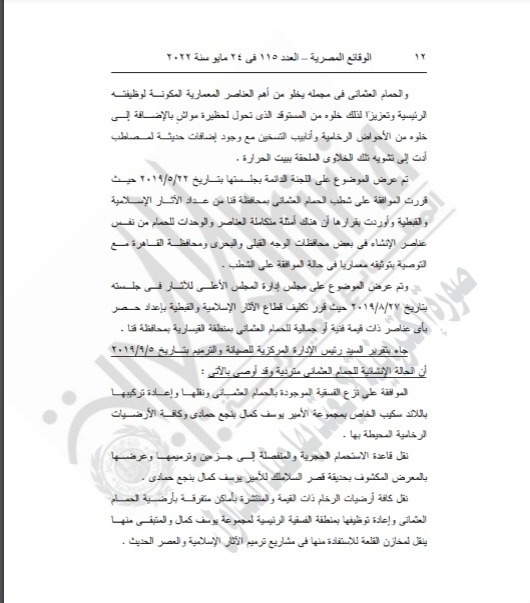 نشرت الجريدة الرسمية، قرار وزارة السياحة والآثار، بشأن شطب الحمام العثماني بمنطقة القيسارية، مدينة قنا، بمحافظة قنا من عداد الآثار الإسلامية والقبطية واليهودية، والمسجل بالقرار الوزاري والمبين الحدود والمعالم بالمذكرة الإيضاحية والخريطـة المساحية المرفقتين.