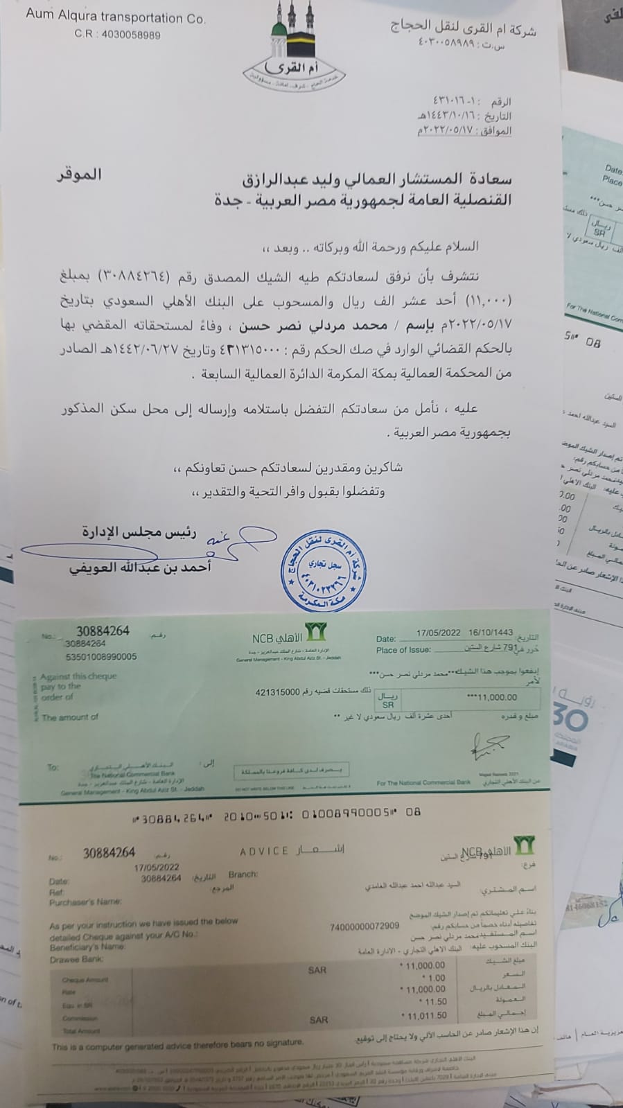 وأضافت وزارة القوى العاملة، أنه بمتابعة هذه الشكوى مع الملحق العمالي، وليد عبد الرازق رئيس مكتب التمثيل العمالي بجدة، أكد أن المكتب نجح في تنفيذ الحكم القضائي مع الشركة، وتم استلام شيك المواطن لإرساله للوزارة وتسليمه له.