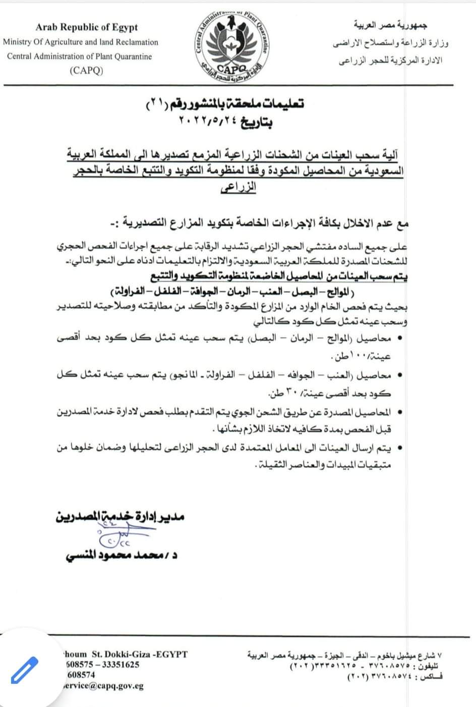 الحجر الزراعي يعلن آلية سحب العينات من الشحنات المصدرة إلى السعودية| مستند