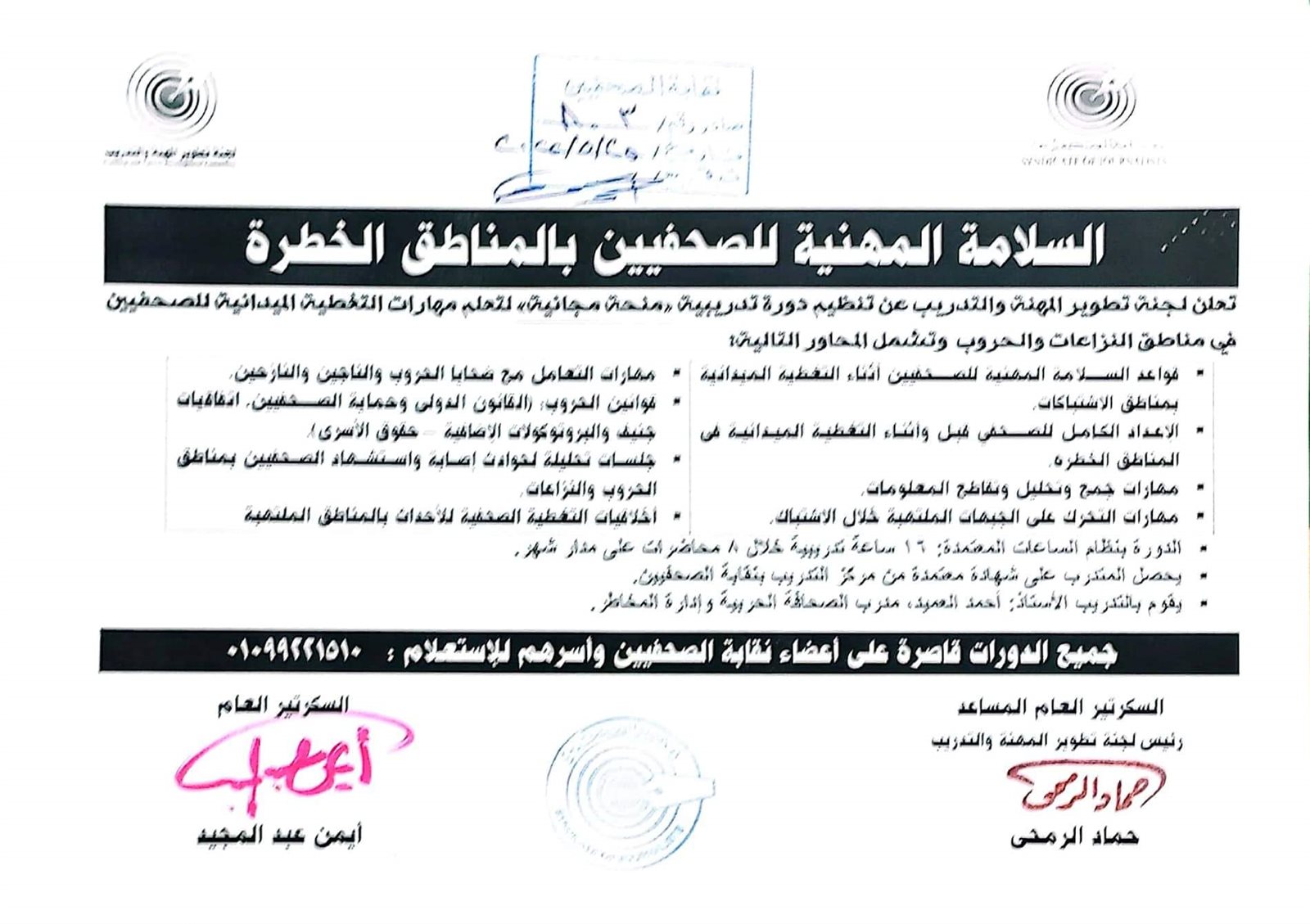 أعلنت لجنة تطوير المهنة والتدريب بنقابة الصحفيين بالقاهرة، برئاسة الكاتب الصحفي حماد الرمحي، السكرتير العام المساعد رئيس لجنة تطوير المهنة والتدريب، تنظيم دورة تدريبية منحة مجانية حول السلامة المهنية للصحفيين بالمناطق الخطرة، وتهدي اللجنة هذه الدورة لروح الشهيدة الصحفية شيرين أبو عاقلة التي اغتالتها رصاصات الغدر الصهيونية بالأراضي الفلسطينية المحتلة.