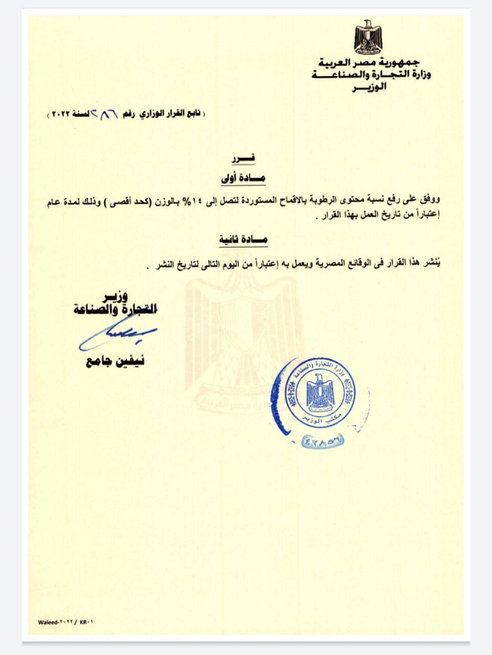 قال الدكتور محمد مجدي، مسؤل الصحة النباتية في الحجر الزراعي، إن قرار وزارة التجارة والصناعة برفع مستوى الرطوبة المقبولة في القمح المستورد إلى 14%، قرار استثنائي، ولمدة عام فقط.