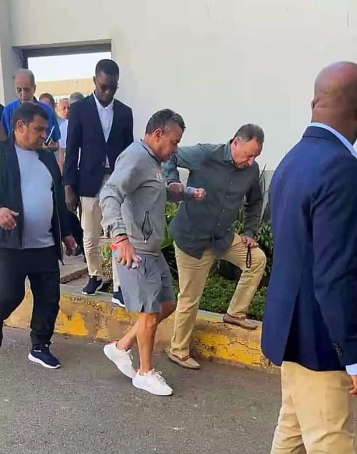 ظهر الكابتن محمود الخطيب رئيس مجلس إدارة النادي الأهلي، ورئيس بعثة القلعة الحمراء في المغرب، في بث مباشر لوفد الأهلي الرسمي وهو يتكئ على خالد مرتجي عضو مجلس إدارة النادي.
