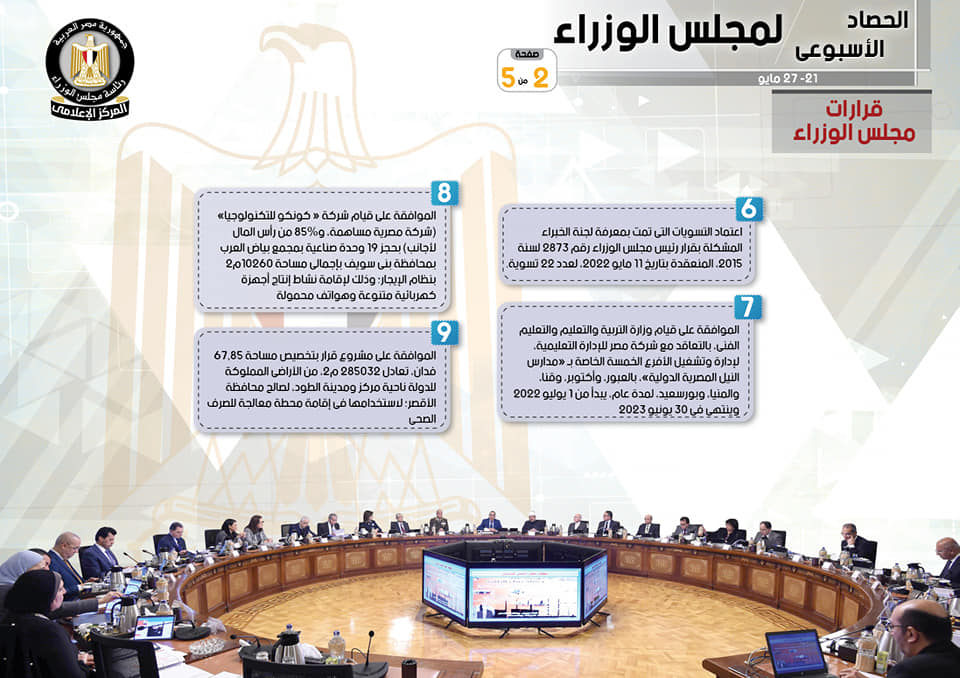نشر المركز الإعلامي لـ مجلس الوزراء، تقريرًا شمل إنفوجرافات سلط من خلالها الضوء على الحصاد الأسبوعي لمجلس الوزراء، وذلك خلال الفترة من 21 حتى 27 مايو 2022، والذي تضمن الموافقة على عدد من القرارات، فضلًا عن الاجتماعات واللقاءات التي عقدها الدكتور مصطفى مدبولي، رئيس مجلس الوزراء، بالإضافة إلى ما قام به من أنشطة.
