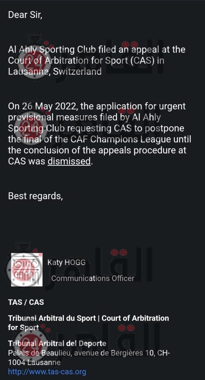 وأوضحت، أنه في يوم 26 مايو 2022؛ تم رفض طلب الإجراءات المؤقتة العاجلة المقدم من النادي الأهلي الرياضي، بمطالبة المحكمة الرياضية بتأجيل نهائي دوري أبطال إفريقيا، لحين الانتهاء من إجراءات الاستئناف أمام المحكمة الرياضية.