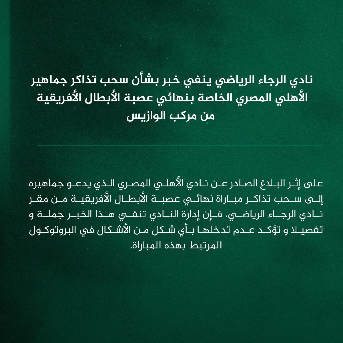 نفى نادي الرجاء المغربي، بيان النادي الأهلي بشأن مكان سحب تذاكر الفريق لمباراة الوداد البيضاوي في نهائي بطولة دوري أبطال إفريقيا.