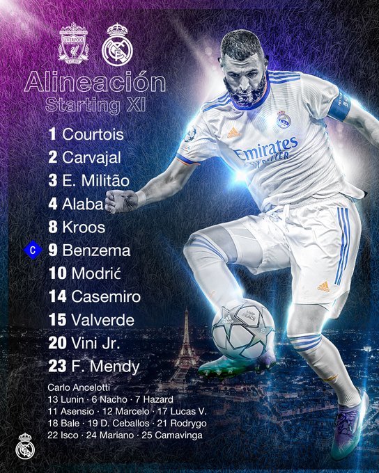 وسيدخل الإيطالي كارلو أنشيلوتي، المدير الفني لـ ريال مدريد، المباراة النهائية في بطولة دوري أبطال أوروبا، ضد ليفربول بتشكيل مكون من: -