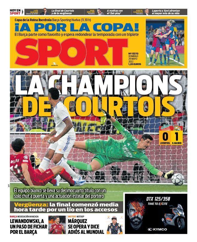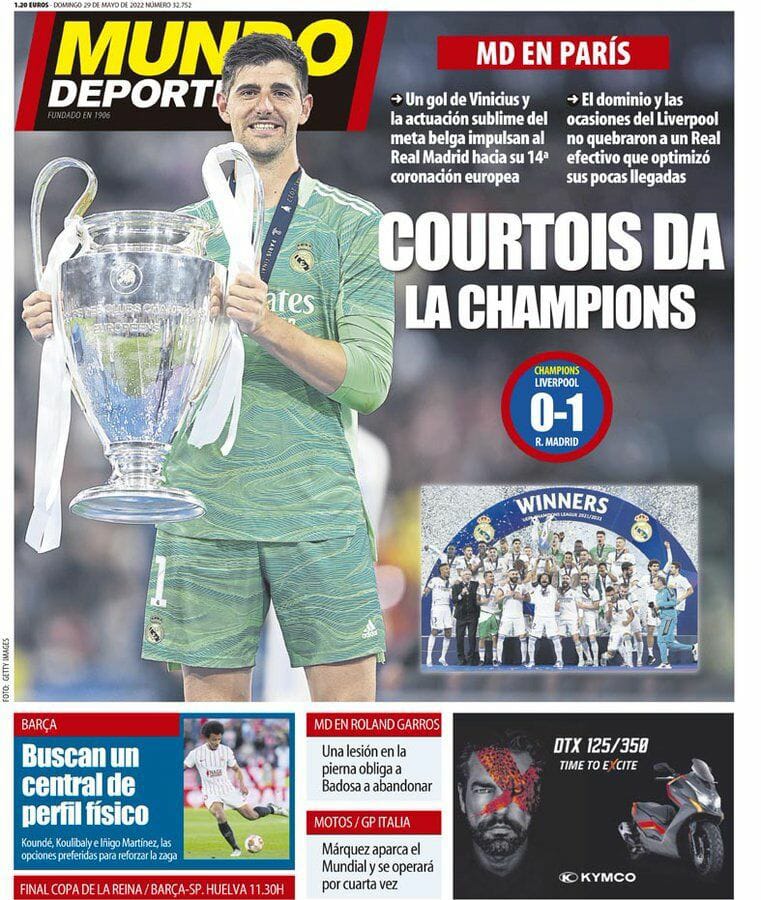 قالت موندو ديبورتيفو في غلافها، إن بطل دوري أبطال أوروبا هو كورتوا، بعد أن أظهر البلجيكي أداءً مميزًا قاد فريقه لمنصات التتويج بتلاشي الخسارة.