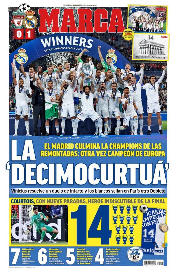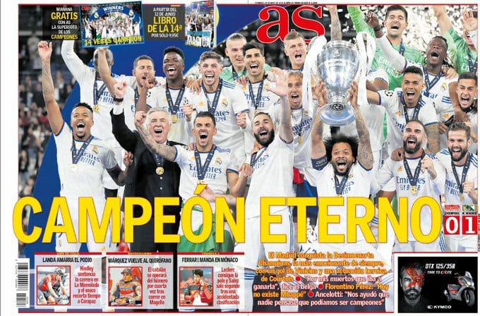 وقالت صحيفة آس في غلافها، إن ريال مدريد بمثابة البطل الأبدي، وذلك بعد أن فاز بأكثر النسخ إثارة في تاريخ بطولات دوري أبطال أوروبا.