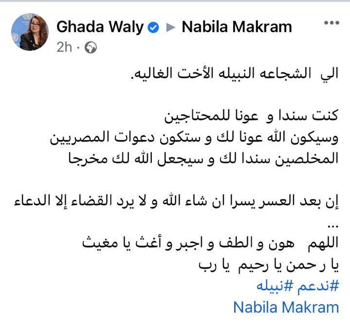 واختتمت الدكتورة غادة والي، منشورها داعية الله باللطف والجبر والغوث للسفيرة نبيلة مكرم عبد الشهيد، قائلة: اللهم هون والطف واجبر وأغث يا مغيث.. یا رحمن يا رحیم یارب.