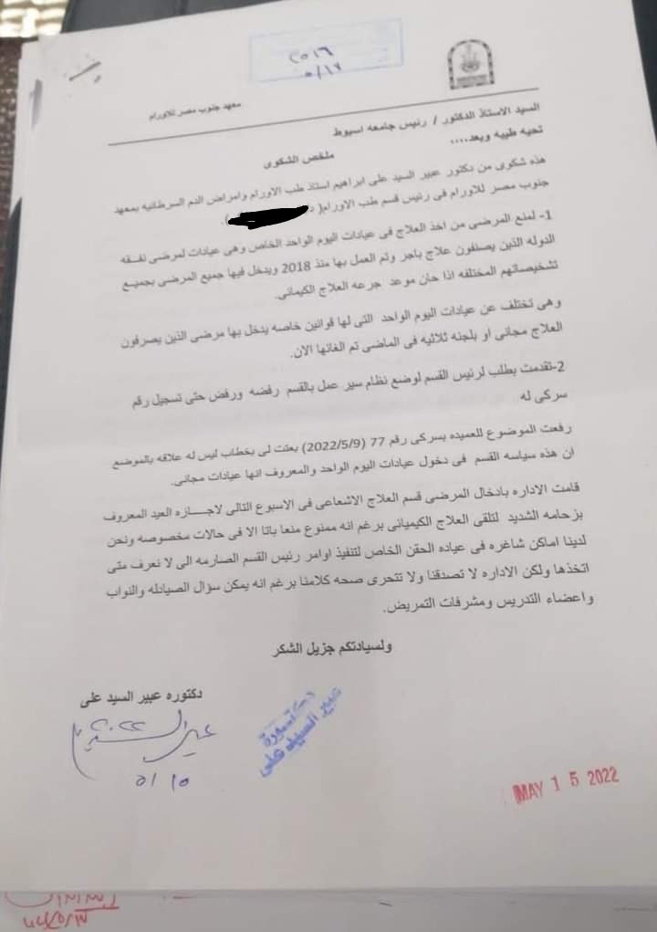 أستاذة أورام بأسيوط تتقدم بشكوى ضد رئيس قسم لمنع المرضى من الحصول على العلاج | مستند
