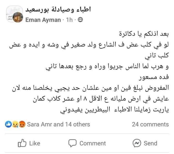 واستغاثت مستخدمة تدعي إيمان أيمن علي جروب فيس بوك خاص بالأطباء البيطريين ببورسعيد، من كلب كشفت أنه قام بعض طفل في يده وعض كلب، وتساءلت عن دلالة هجومه علي الأشخاص والحيوانات، وهل تؤكد أنه مسعور أم لا.